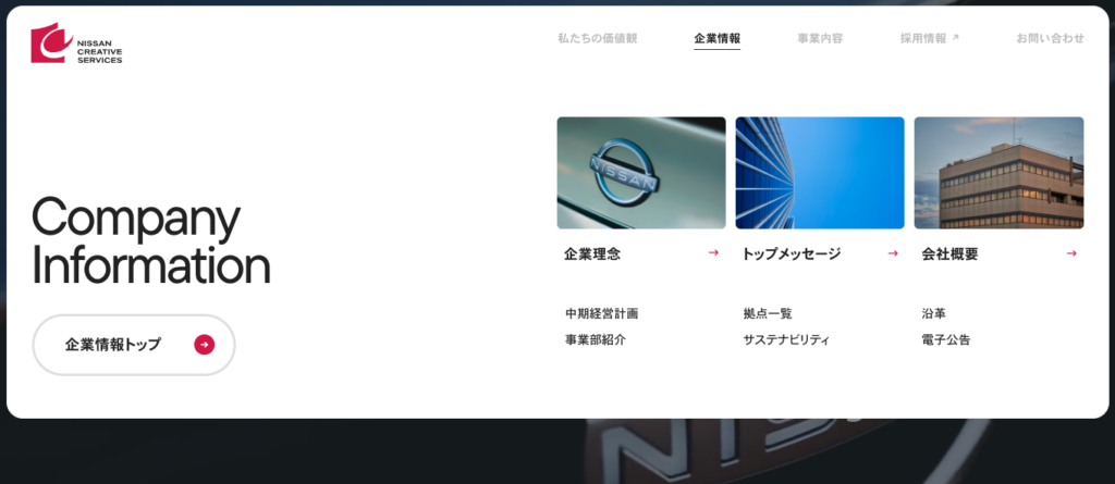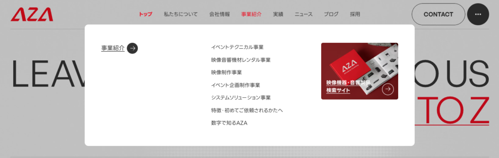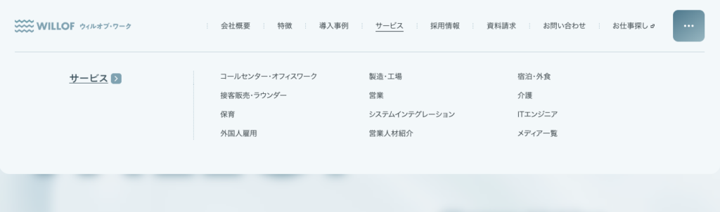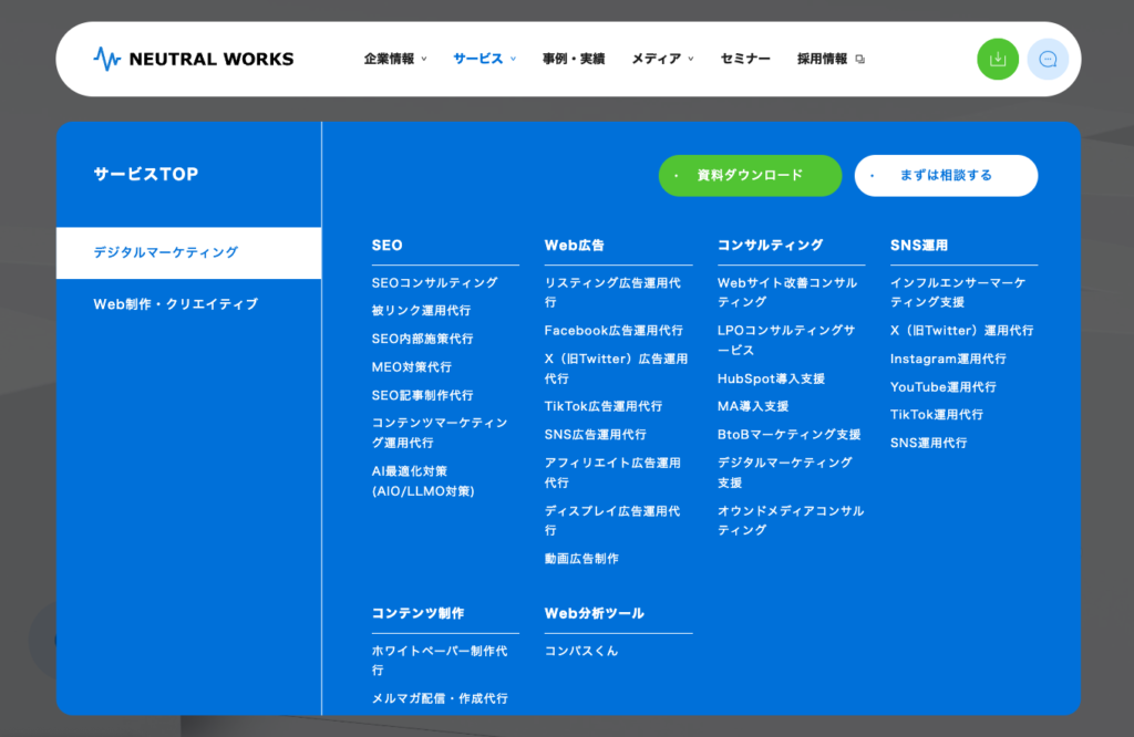 メガメニューとは、ナビゲーションにおける階層の多いコンテンツや複雑な情報を一覧で見せるためのUIパーツです。通常のドロップダウンメニューよりも広い領域を使い、カテゴリや情報を視覚的に整理して表示できるのが特徴です。